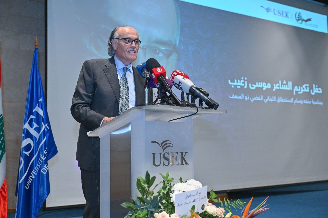 حلّ “ملك الزجل اللبناني” الشاعر الكبير موسى زغيب مكرَّماً في جامعة الروح القدس – الكسليك، في احتفال مميّز أقامته نقابة شعراء الزجل في لبنان وعائلته، بمناسبة منحه وسام الاستحقاق اللبناني الفضي ذو السعف، بحضور رسمي وثقافي وروحي واسع.