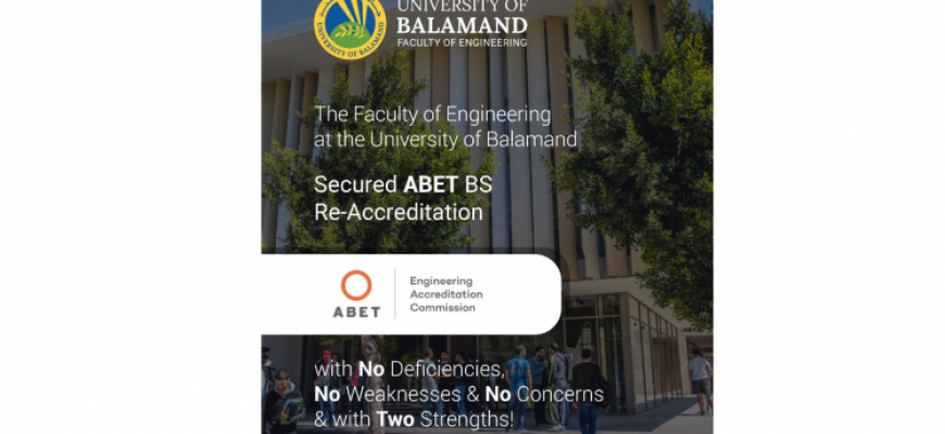 حققت كلية الهندسة في "جامعة البلمند" إنجازاً أكاديمياً استثنائياً، بتجديد اعتماد "ABET" لجميع برامج البكالوريوس الـ5، وهي: الهندسة المدنية، والكهربائية، والكيميائية، وهندسة الكمبيوتر، والهندسة الميكانيكية، وذلك من دون أي نواقص أو ملاحظات أو نقاط ضعف.